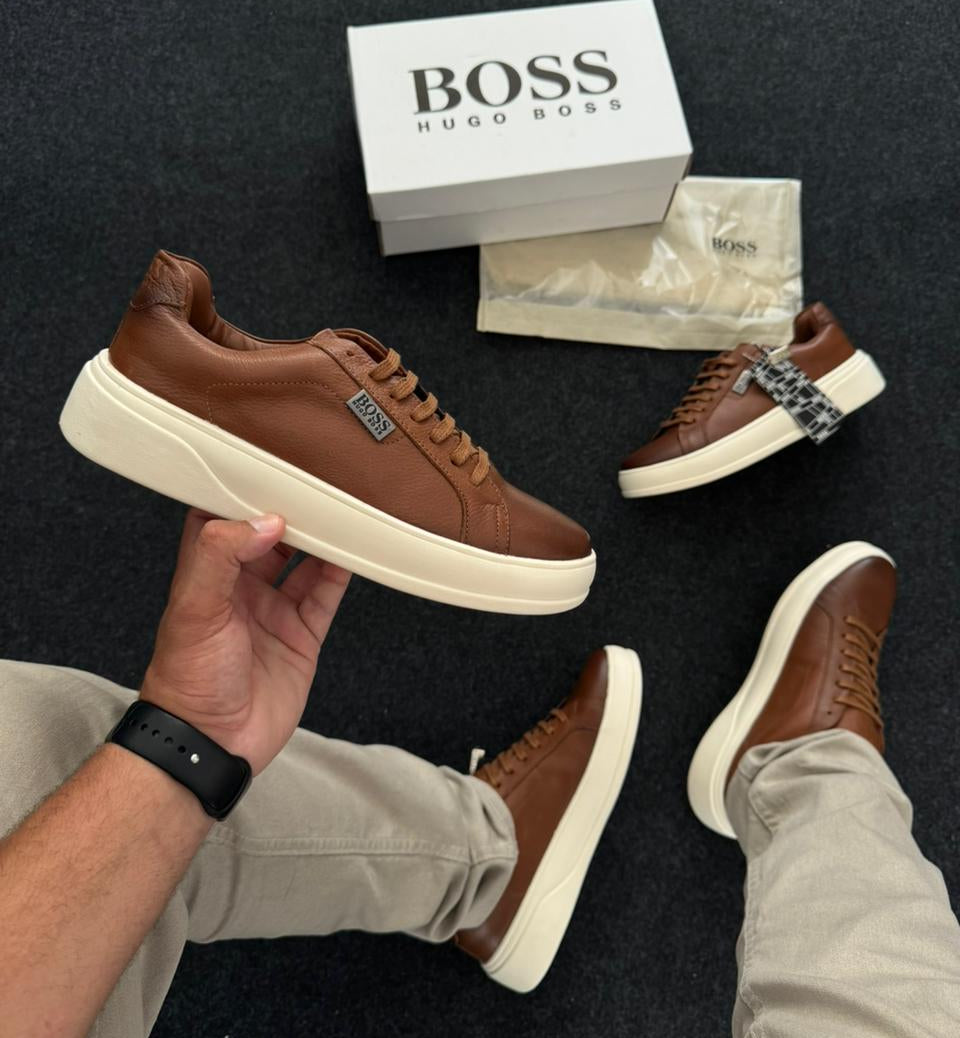 Sapatênis Hugo Boss Premium - 100% Couro Legítimo | Conhaque & Off-White