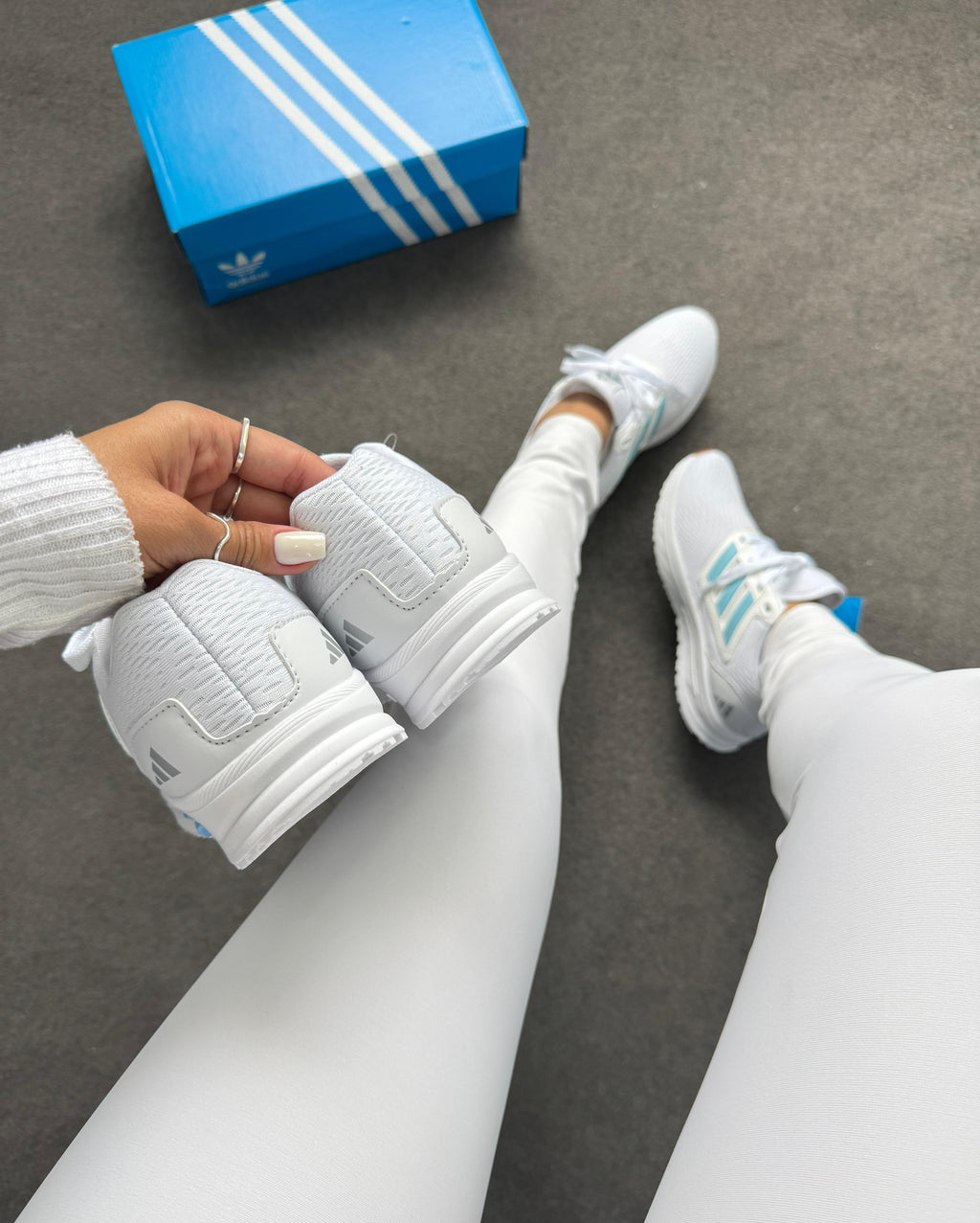 Design minimalista em branco gelo com detalhes azul claro — transmite leveza, frescor e elegância (ideal para looks casuais, academia e rotina).